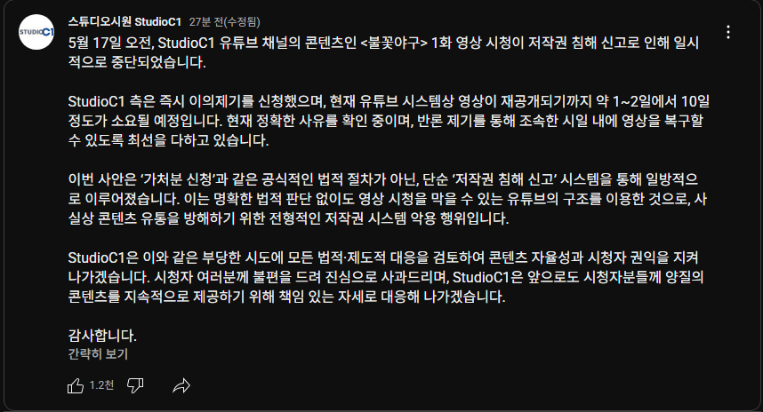 이에 대해 스튜디오 C1 측은 커뮤니티 게시글을 통해 “JTBC의 저작권 신고는 법적 판단 없이 시스템을 악용한 사례”라고 비판하며, 반론 통지를 제출해 대응 중이라고 밝혔습니다. 현재까지 채널 폐쇄는 발생하지 않았으며, 일부 영상은 반론 접수 이후 다시 시청 가능해진 상태입니다.